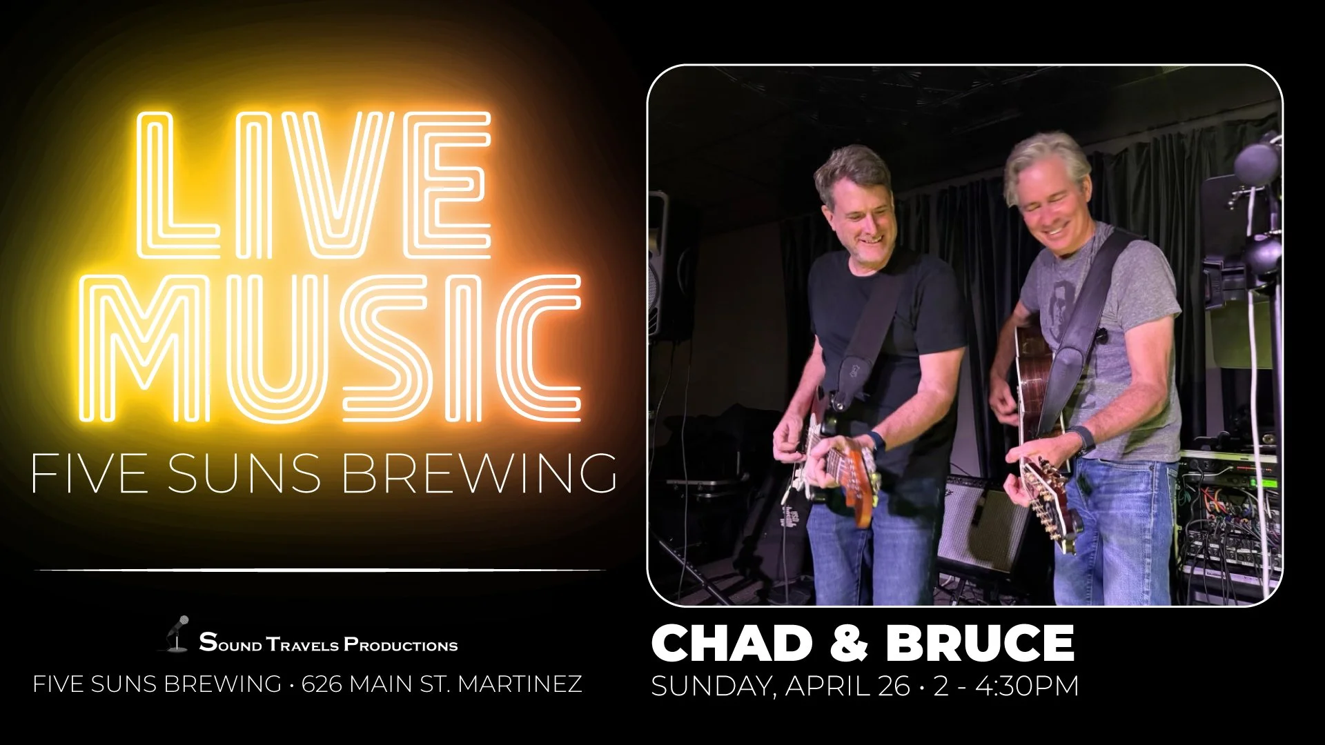 Back to All Events Live Music – Chad & Bruce Sunday, April 26, 2026 2:00 PM 4:30 PM Five Suns Brewing 626 Main Street Martinez, CA, 94553 United States (map) Google Calendar ICS Get ready for a nostalgic, high-energy session as Chad and Bruce, also known as CBD, perform live music! This dynamic duo is stripping down your favorite 80s and 90s hits for an afternoon of relaxing acoustic music.