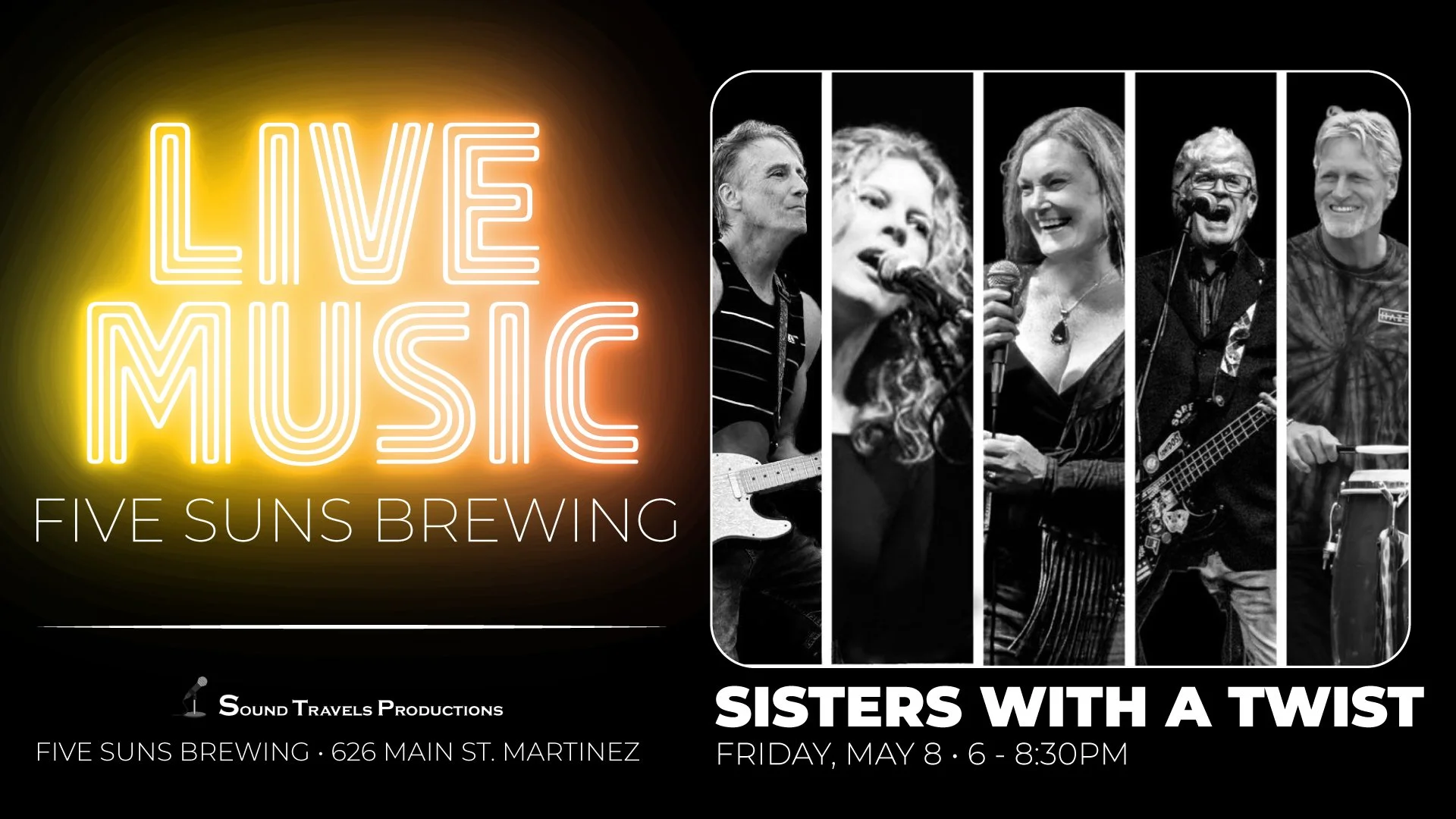 Back to All Events Live Music – Sisters with a Twist Friday, May 8, 2026 6:00 PM 8:30 PM Five Suns Brewing 626 Main Street Martinez, CA, 94553 United States (map) Google Calendar ICS Female vocal duo Carol Bower & Aimee Abbett, guitarist/vocalist Marcus Cole, bassist/vocalist Mike Maxwell and percussionist Jan Liband promise to astound you with their acoustic arrangements of Americana & Rock.