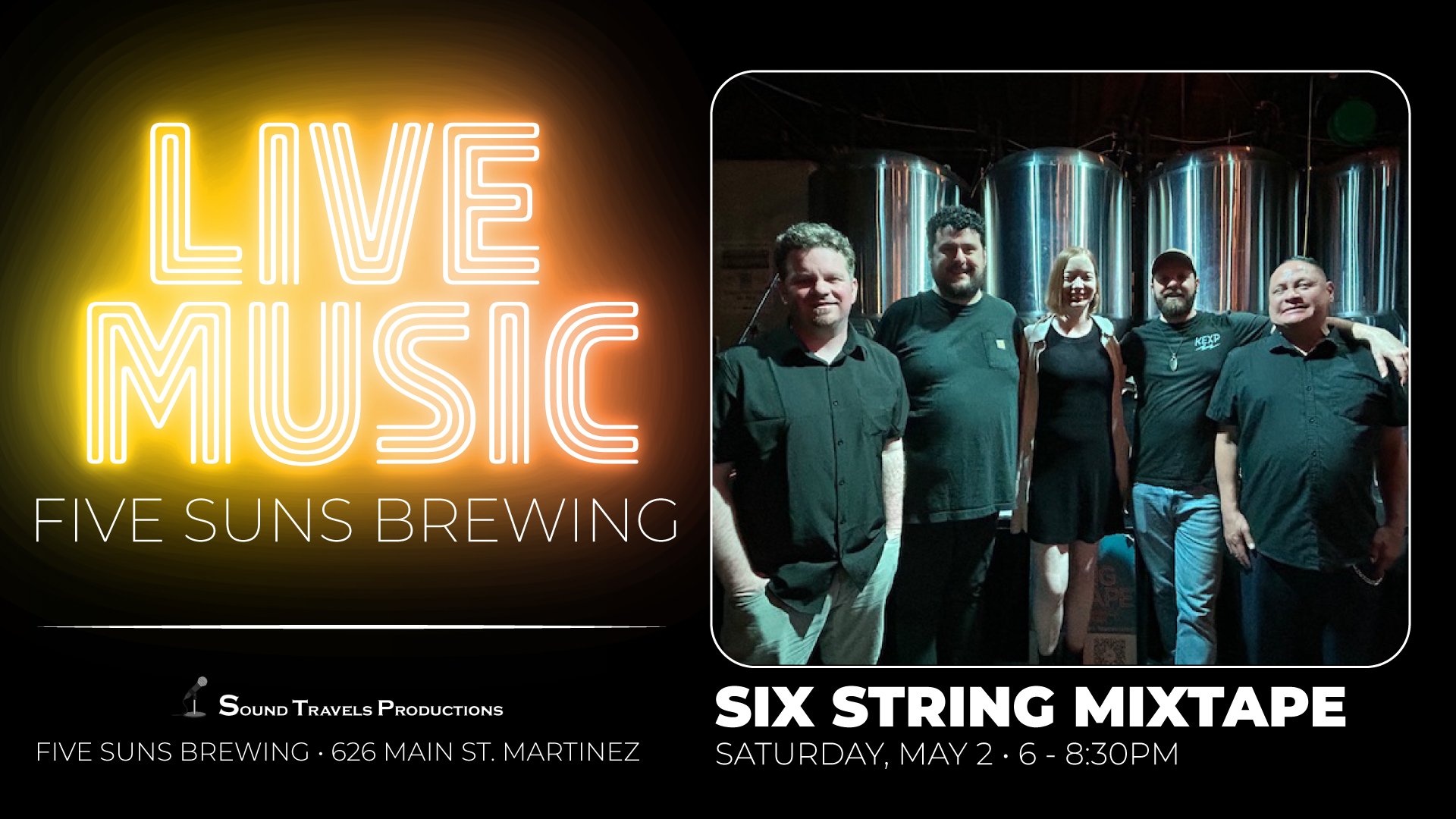 Live Music – Six String Mixtape Saturday, May 2, 2026 6:00 PM 8:30 PM Five Suns Brewing 626 Main Street Martinez, CA, 94553 United States (map) Google Calendar ICS A full 5-person band that covers of some of the most recognizable and toe-tapping songs instruments can play. They are best known in and around the Bay Area for playing breweries, private events and just for fun!